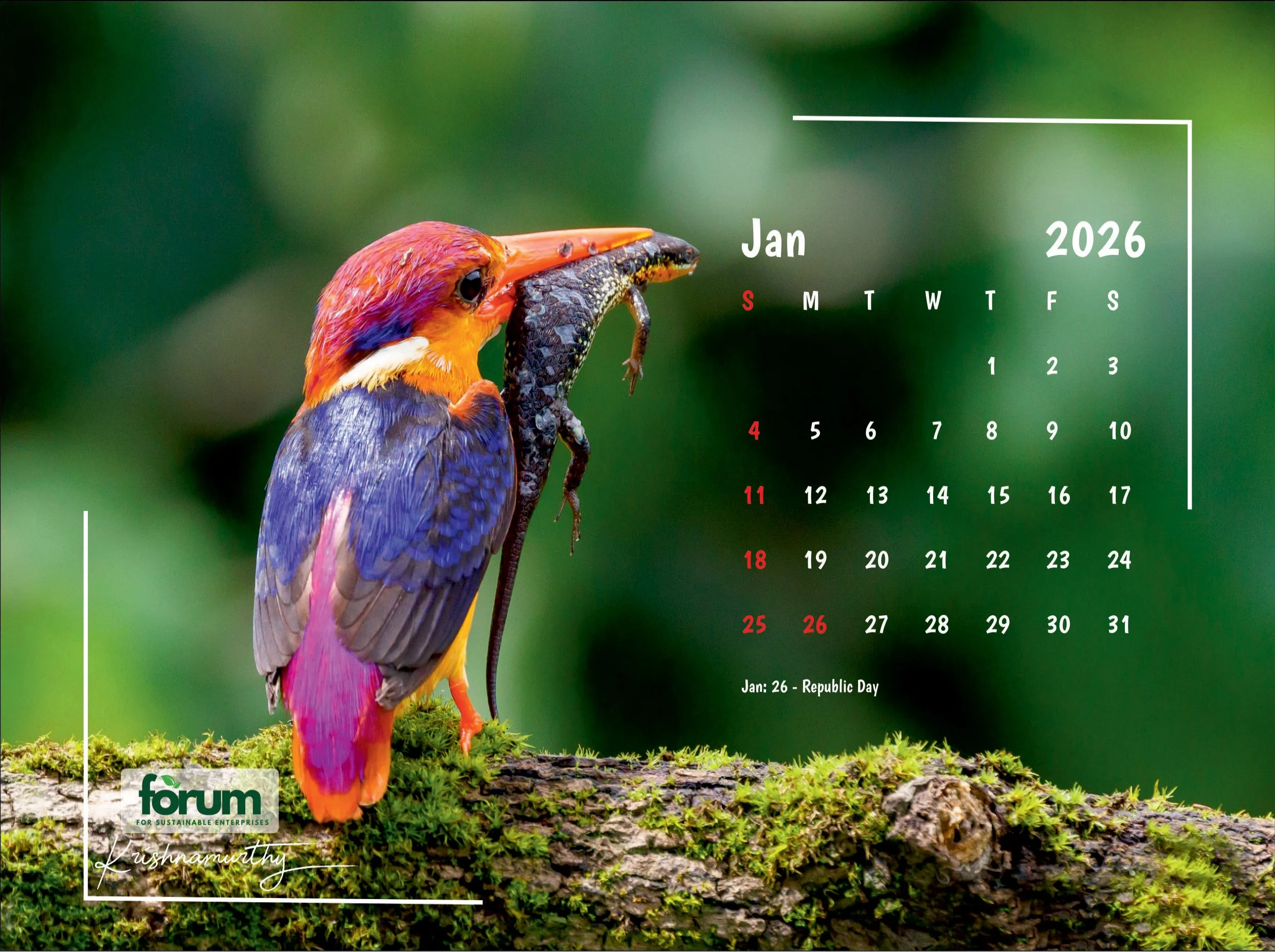 An Oriental Dwarf Kingfisher pauses on a moss-laden perch at Apta, its iridescent blues, purples, and fiery orange glowing against a soft green backdrop. Clutching a freshly caught skink in its vivid red bill, the moment captures both the bird’s jewel-like beauty and its fierce efficiency as a hunter - nature’s brilliance distilled into a single frame.