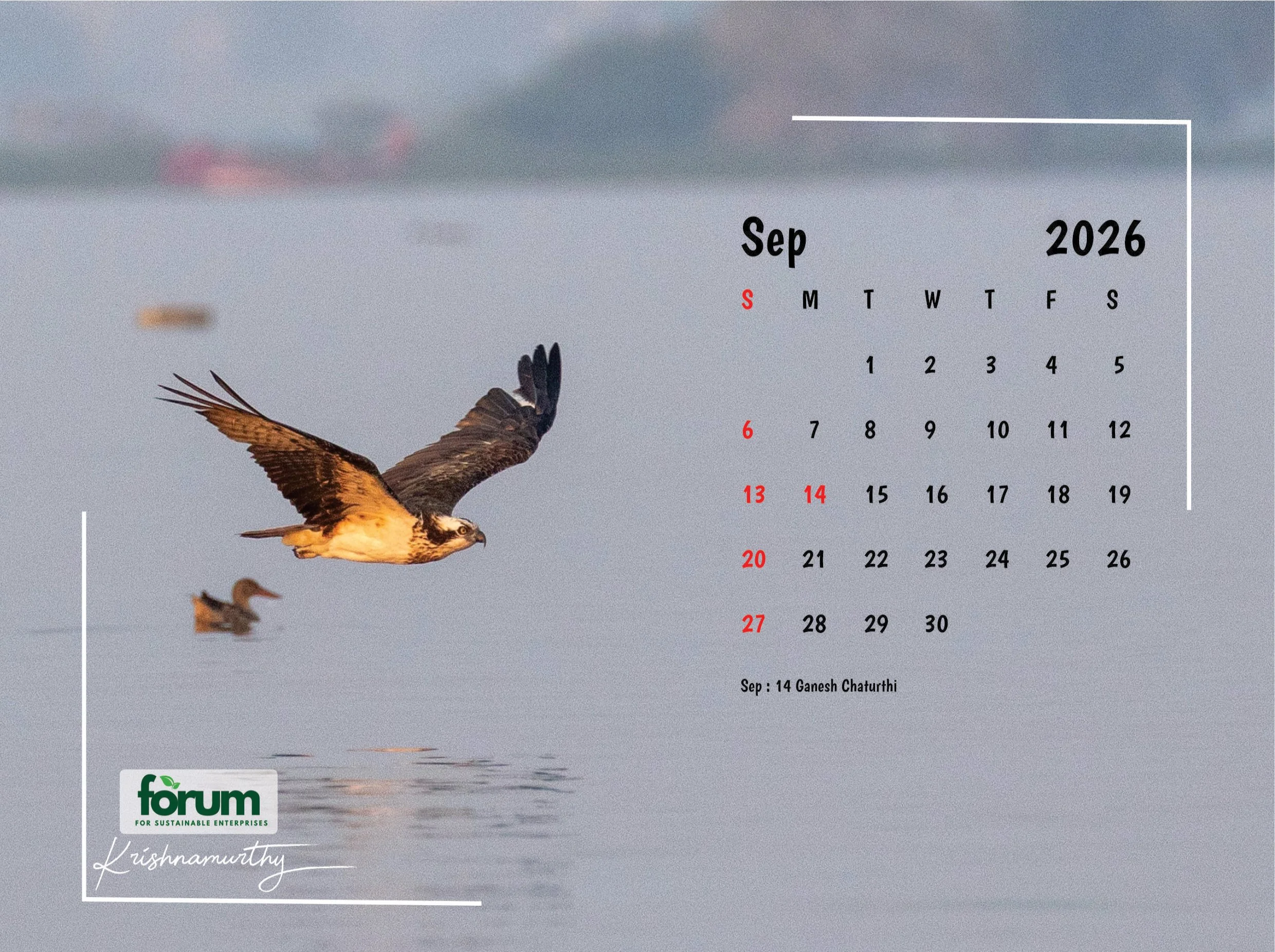 An Osprey skims low over the calm waters of Bhigwan, wings outstretched as it scans for fish beneath the surface. The muted tones of the misty backwaters and distant trees create a serene backdrop, highlighting the raptor’s focused flight and the quiet drama of this renowned wetland landscape.