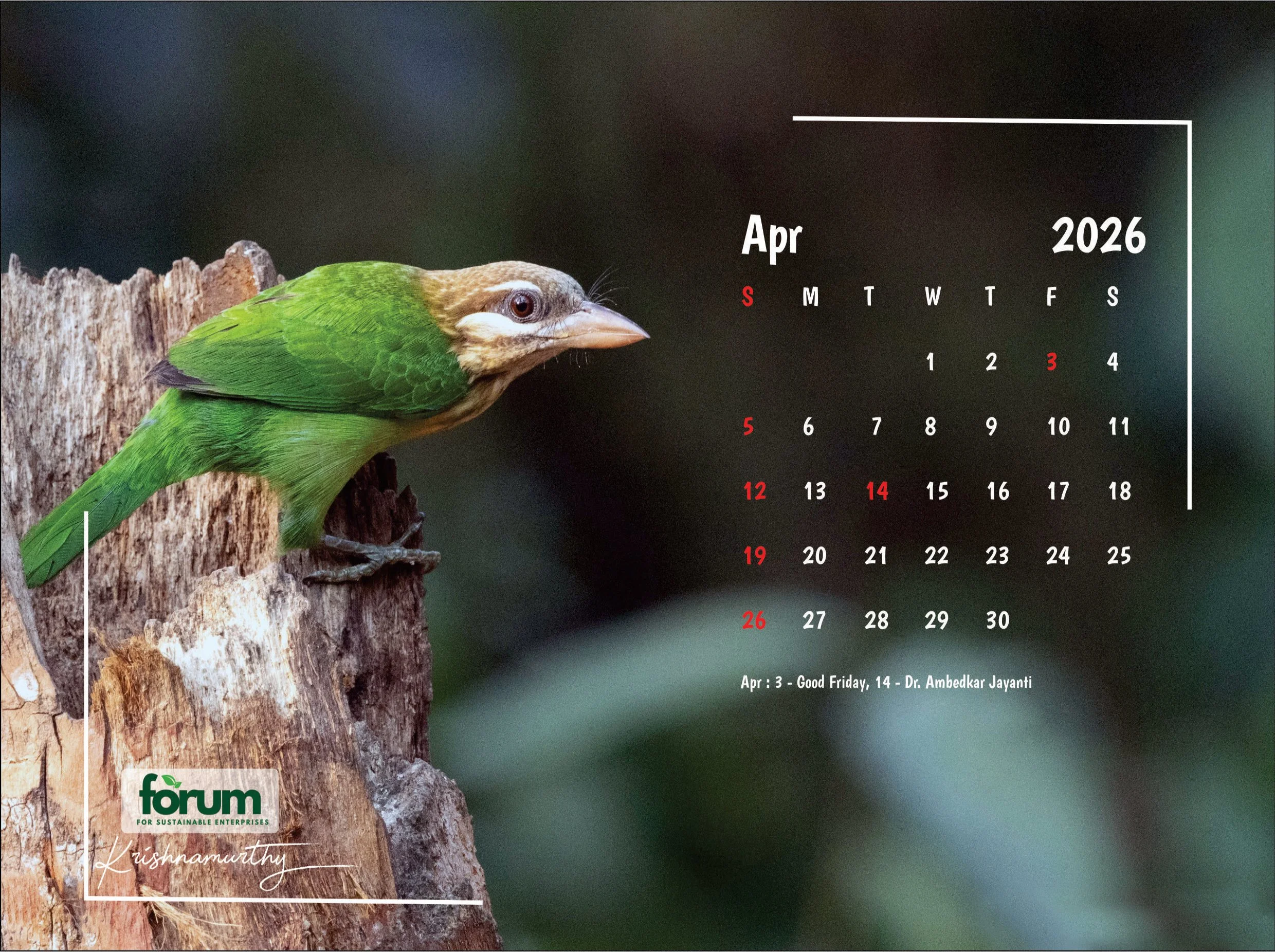 A White-cheeked Barbet peers out from a weathered tree trunk in the rainforests of Thattekad. Its vivid green plumage blends seamlessly with the forest canopy, while the alert posture suggests a brief pause between calls in this richly biodiverse bird sanctuary.