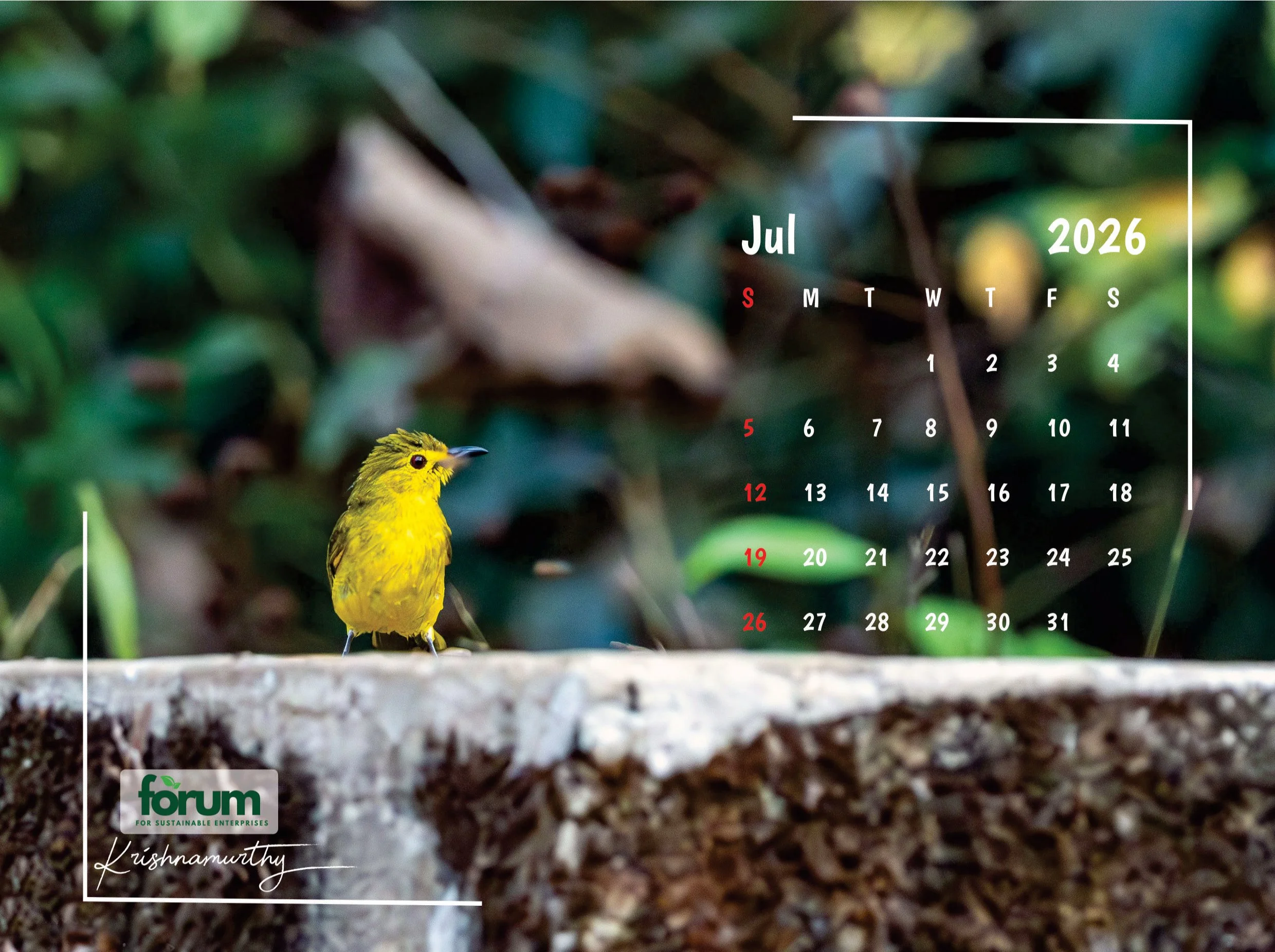 A small golden-yellow bird pauses on a moss-lined ledge at Thattekad, its bright plumage glowing against the deep green forest backdrop. The contrast between the vivid subject and the softly blurred undergrowth draws the eye, capturing a quiet, contemplative moment within the dense rainforest habitat.